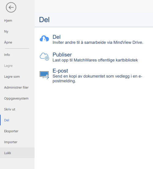 Det finnes flere måter å dele tankekartet ditt på med andre. Du finner alternativene ved å klikke på Fil-fanen og velge Del i menyen på venstre side.